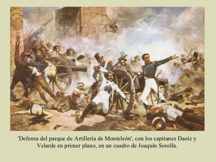 Seguidamente, los capitanes Daoiz y Velarde distribuyeron a ciudadanos y soldados en secciones al mando de oficiales. Se ordenó apuntar con tres piezas de artillería hacia el portón tras el cual esperaban los franceses preparados para atacar. Abrieron fuego así los artilleros españoles llevándose por delante hasta las macizas puertas del parque que cayeron como losas sobre la fuerza enemiga. Dispararon, una y otra vez, al mando del Capitán, sus botes de metralla logrando frenar así las diversas cargas que el batallón francés de infantería osó lanzar contra el parque. Subieron los soldados imperiales por las calles de Fuencarral y San Bernardo, pretendían apoderarse de Monteleón, más se encontraron con los cañones comandados por Daoiz que les causó numerosas bajas.