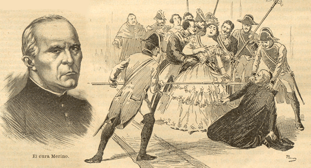 El 7 de febrero de 1852, Manuel Martín Merino y Gómez, a sus sesenta y tres años, murió ajusticiado por el garrote; la descripción física que aporta Fernández de los Ríos es la de un hombre “alto de cuerpo, enjuto de carnes, pelo enteramente blanco y de constitucion robusta”. La sentencia fue dictada por el juez de primera instancia de la corte, Pedro Nolasco Aurioles, “que debía condenar y condenaba á D. Martin Merino y Gómez á la pena de muerte en garrote, con arreglo á lo dispuesto en los artículos 160 y 89 del Código Penal, al resarcimiento de los gastos ocasionados por el juicio y al pago de las costas procesales, mandando que la ejecucion se verifique en las afueras de la puerta de Santa Bárbara de esta capital; que el reo sea conducido al patíbulo con hopa amarilla y un birrete del mismo color, una y otro con manchas encarnadas, conforme á lo prevenido en el art. 91; que luego que esta sentencia cause ejecutoria, se pase testimonio literal de ella, con el oportuno oficio, al eminentísimo y Excmo. Sr. Metropolitano para que se proceda á la degradacion correspondiente del reo, en observacion de lo establecido por el artículo 5º del real Decreto de 17 de Octubre de 1835 […]”; además, el mismo 7 de febrero, a las cinco menos cuarto de la tarde se quemó su cadáver, en el cementerio “extramuros de la puerta de Bilbao”, y se esparcieron sus cenizas en una sepultura común.
